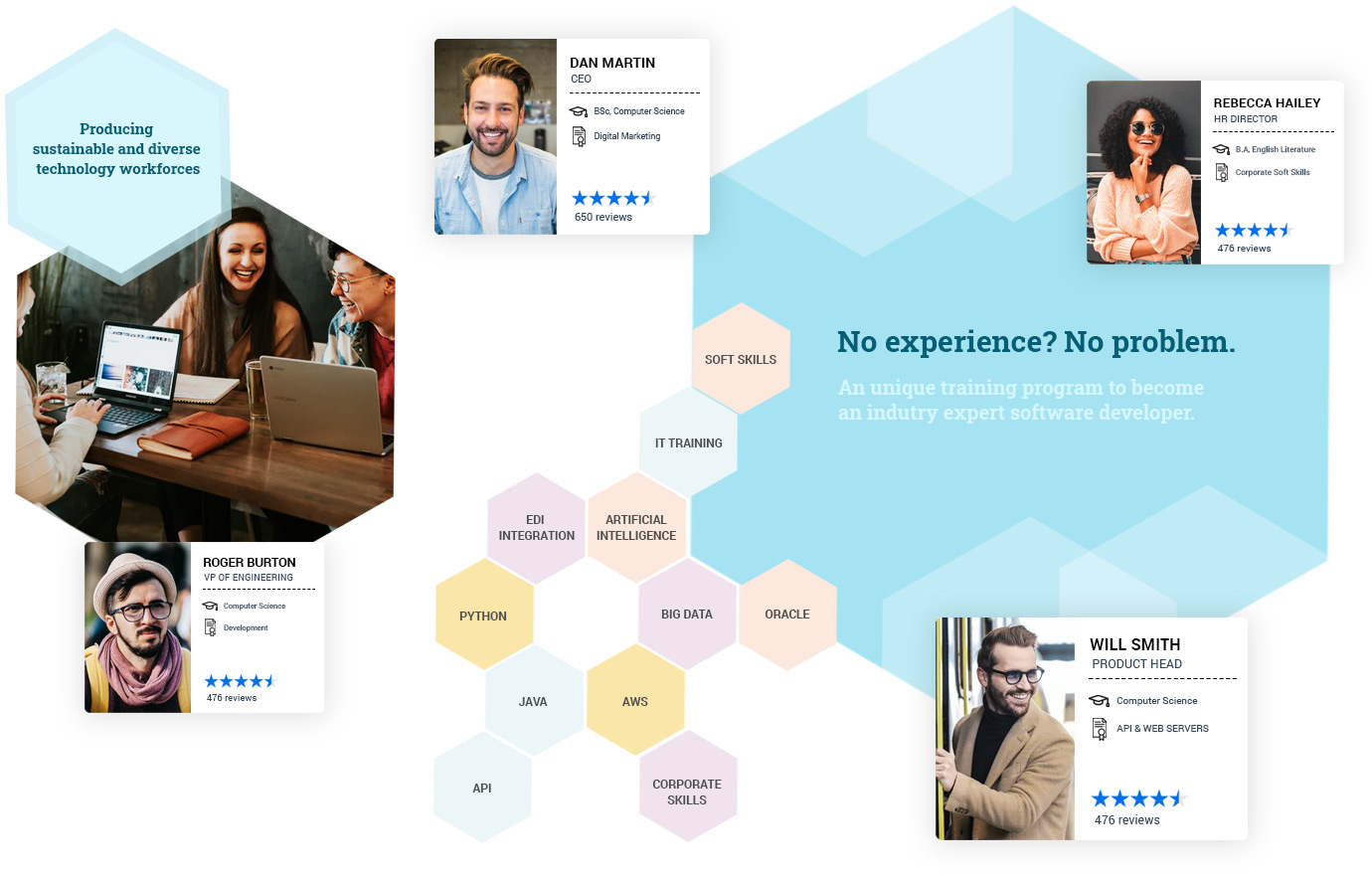 - After completing the apprenticeship program, our fellows launch their careers in different technological jobs in companies like Google, Amazon, Apple, IBM and Microsoft.
